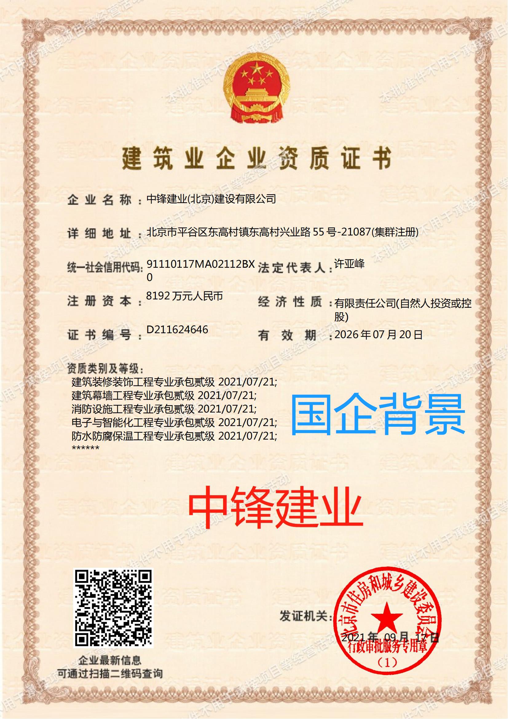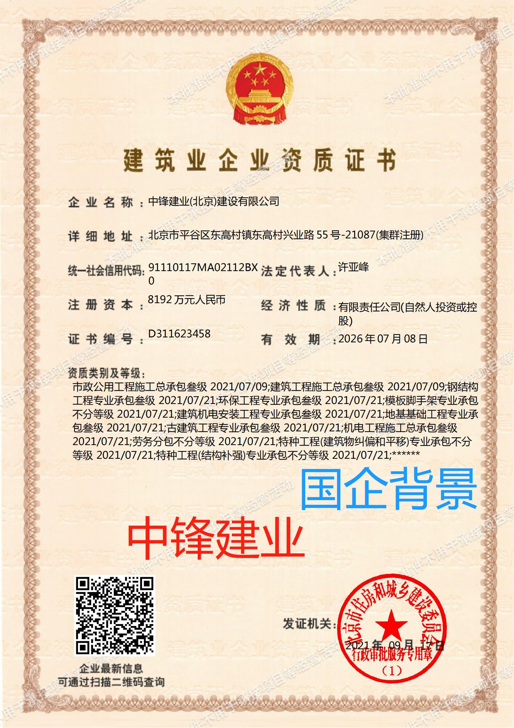 中鋒建業(北京)建設有限公司資質